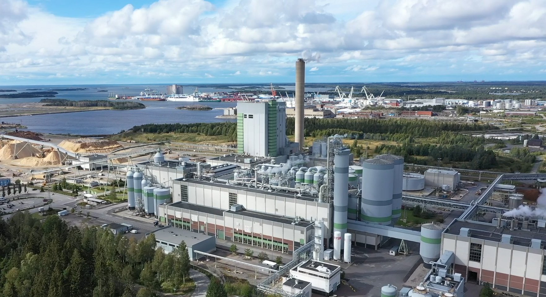 Rauman sellutehdas Raumanmeren rannalla. Taustalla Rauman satamaa ja meriteollisuuspuistoa. (Kuva: Metsä Group)