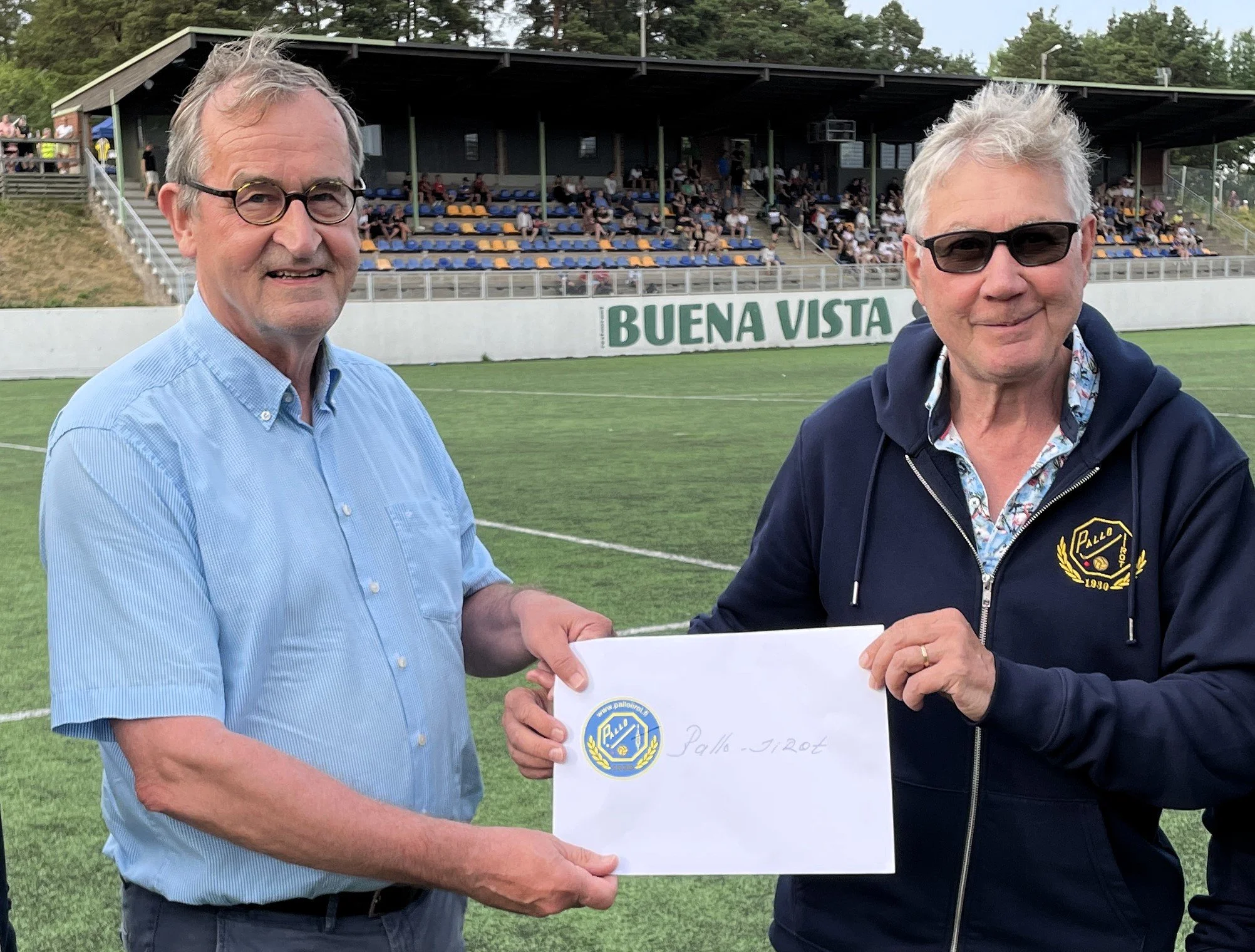Jarmo Savikurki (vas.) Pallo-Iirojen puheenjohtajana ottamassa vastaan Iiro-Vaarien lahjoitusta tukiyhdistyksen puheenjohtaja Arto Uusitorpalta. (Kuva: Janne Rantanen)