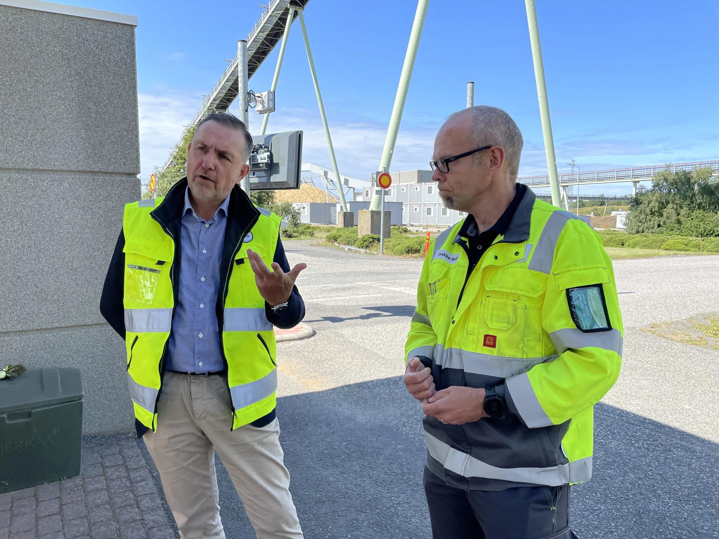 Metsä Fibren sellutehtaan johtaja Jaakko Ikonen (oik.) kertoi syksyllä Rauman Energian toimitusjohtaja Marko Haapalan kanssa medialle uudesta yhteistyöstä. Sellutehtaan ylijäämälämpöä aletaan hyödyntää raumalaisten kotien lämmityksessä. Uutta runkoverkkoa rakennetaan parhaillaan. (Kuva: Janne Rantanen)