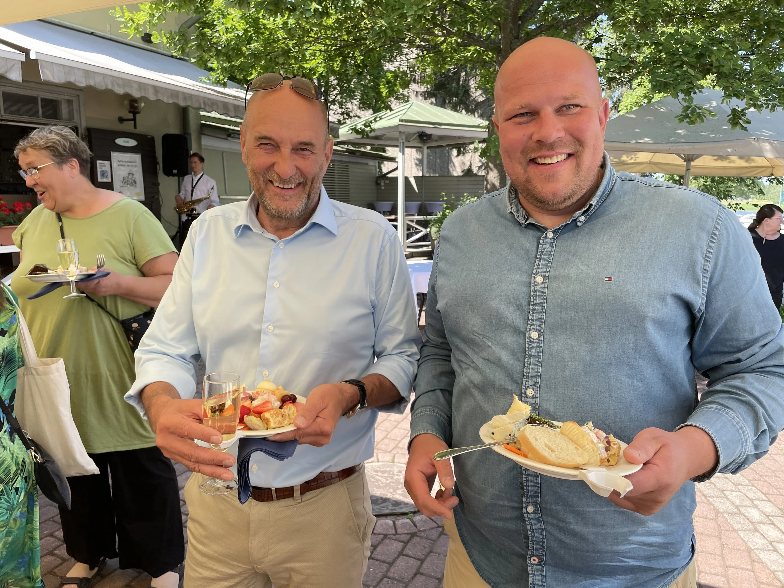 Kaupunginjohtaja Esko Poikela (vas.) ja kaupunginhallituksen puheenjohtaja Kalle Leppikorpi isännöivät Rauman kaupungin tilaisuutta Porissa edellissuvena. (Kuva: Janne Rantanen)