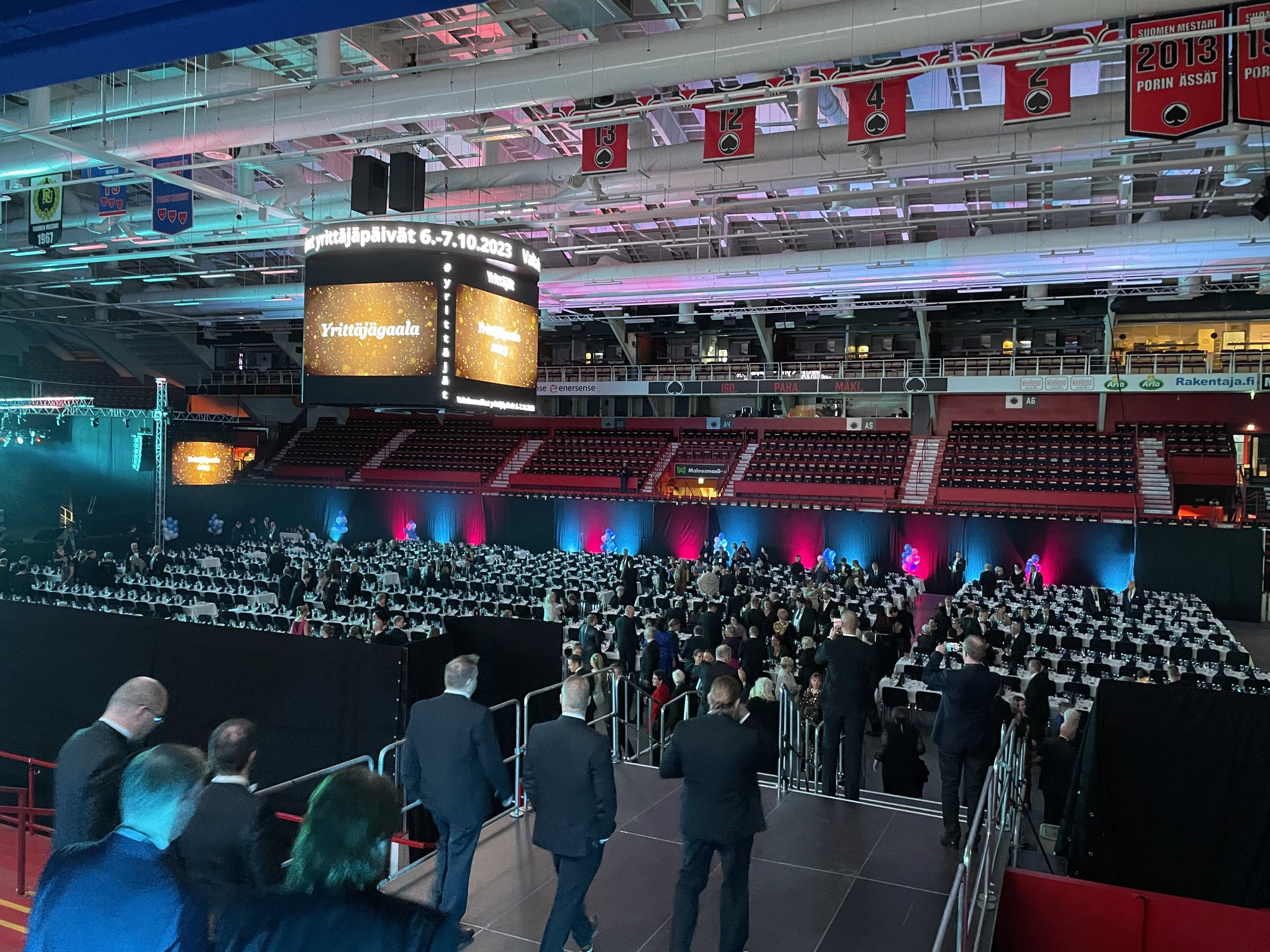 Porin jäähalli, Isomäki Areena, avattiin vuonna 1971. Nyt se on yllättävän kalliin kattoremontin tarpeessa. Kuva valtakunnallisesta Yrittäjägaalasta vuonna 2023. (Kuva: Janne Rantanen)