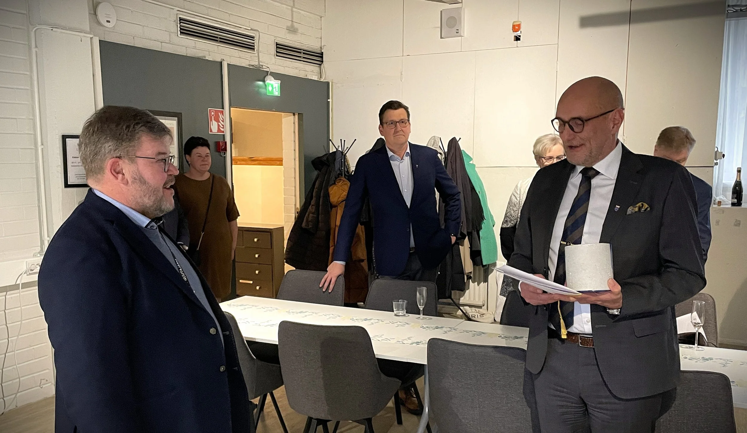 Ari Salmi järjesti pienen kutsuvierastilaisuuden Nuutajärven lasikylässä helmikuussa 2025. Tässä tuoretta teollisuusneuvosta onnittelemassa Rauman kaupunginjohtaja Esko Poikela. (Kuva: Janne Rantanen)