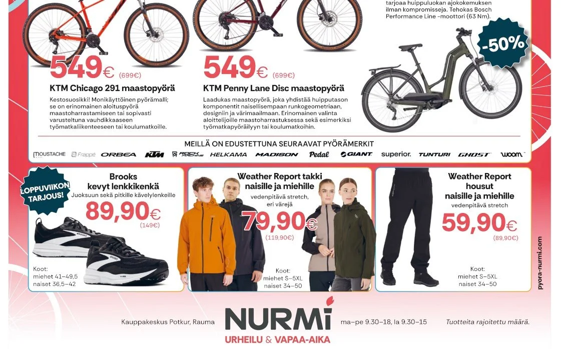 Osa Pyörä-Nurmen etusivun mainoksesta Satakunnan Kansassa. Pyörää ei enää näy logossa, mutta fillareita Nurmi silti myy yhä. Ja paljon.