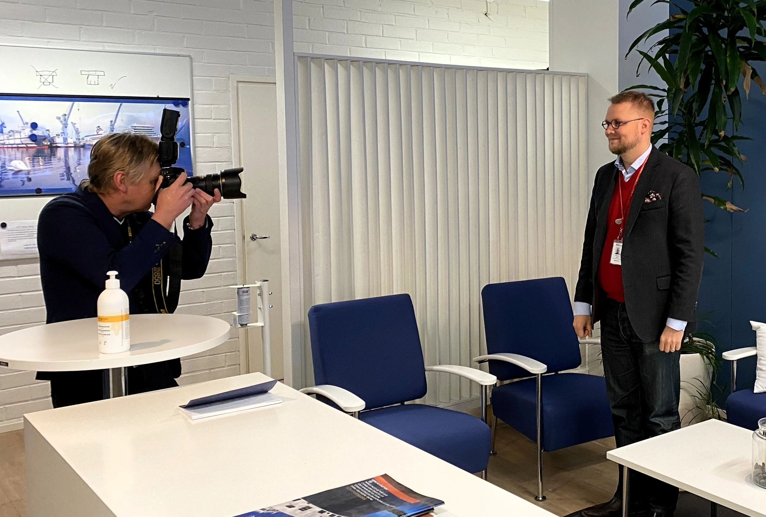 Juha Sinisalo Länsi-Suomen juttukeikalla kuvaamassa Mika Heiskasta Rauman telakalla joulukuussa 2022. (Kuva: Janne Rantanen)