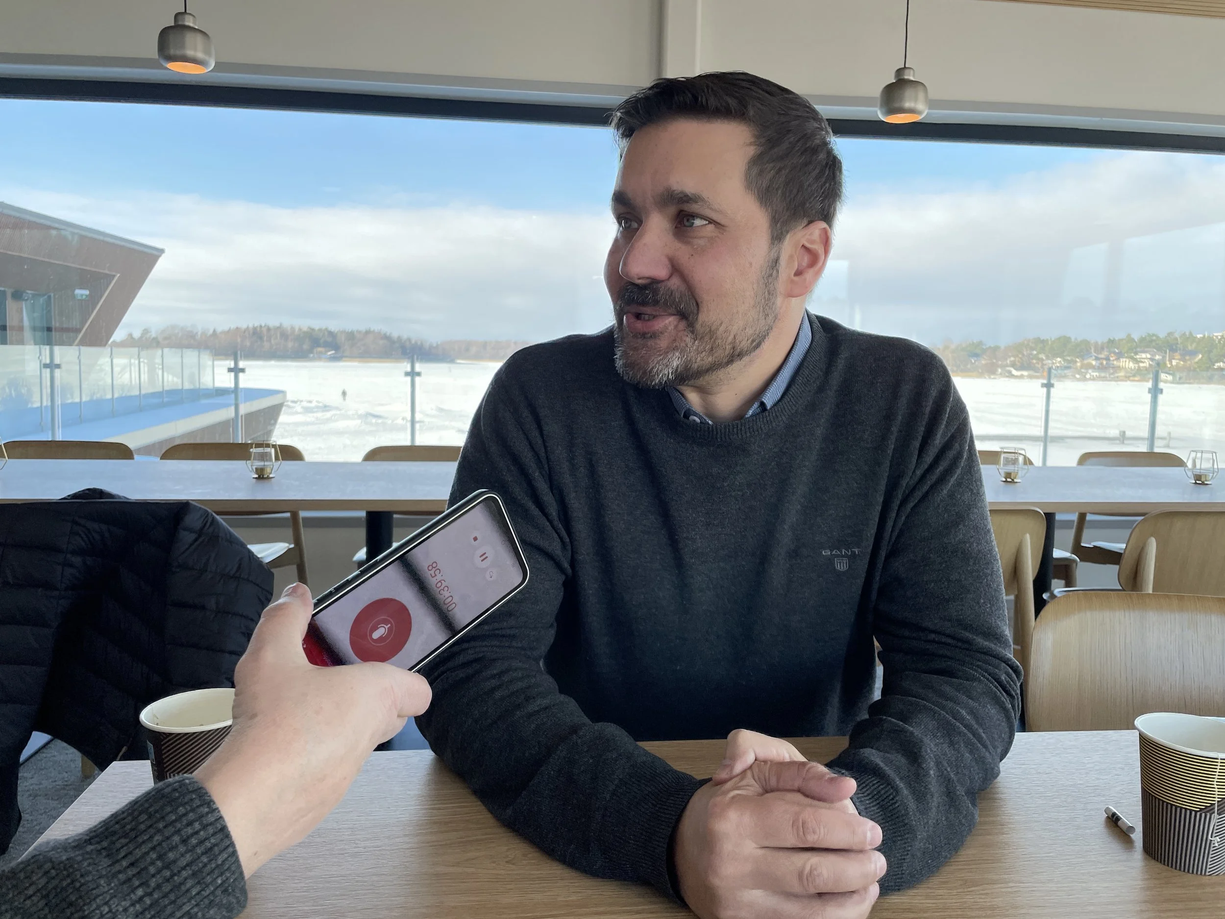 Rauman Sataman toimitusjohtaja Raumaplussan eli meikäläisen ja nauhoitusyksikköä pitelevän Risto Leinon haastattelussa. (Kuva: Janne Rantanen)
