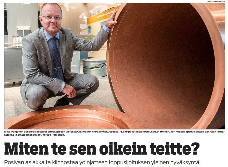 Loppusijoituksessa käytettävien kuparikapselien malleja on pitkään ollut esillä Olkiluodon vierailukeskuksessa. (Länsi-Suomen uutinen vuodelta 2016)