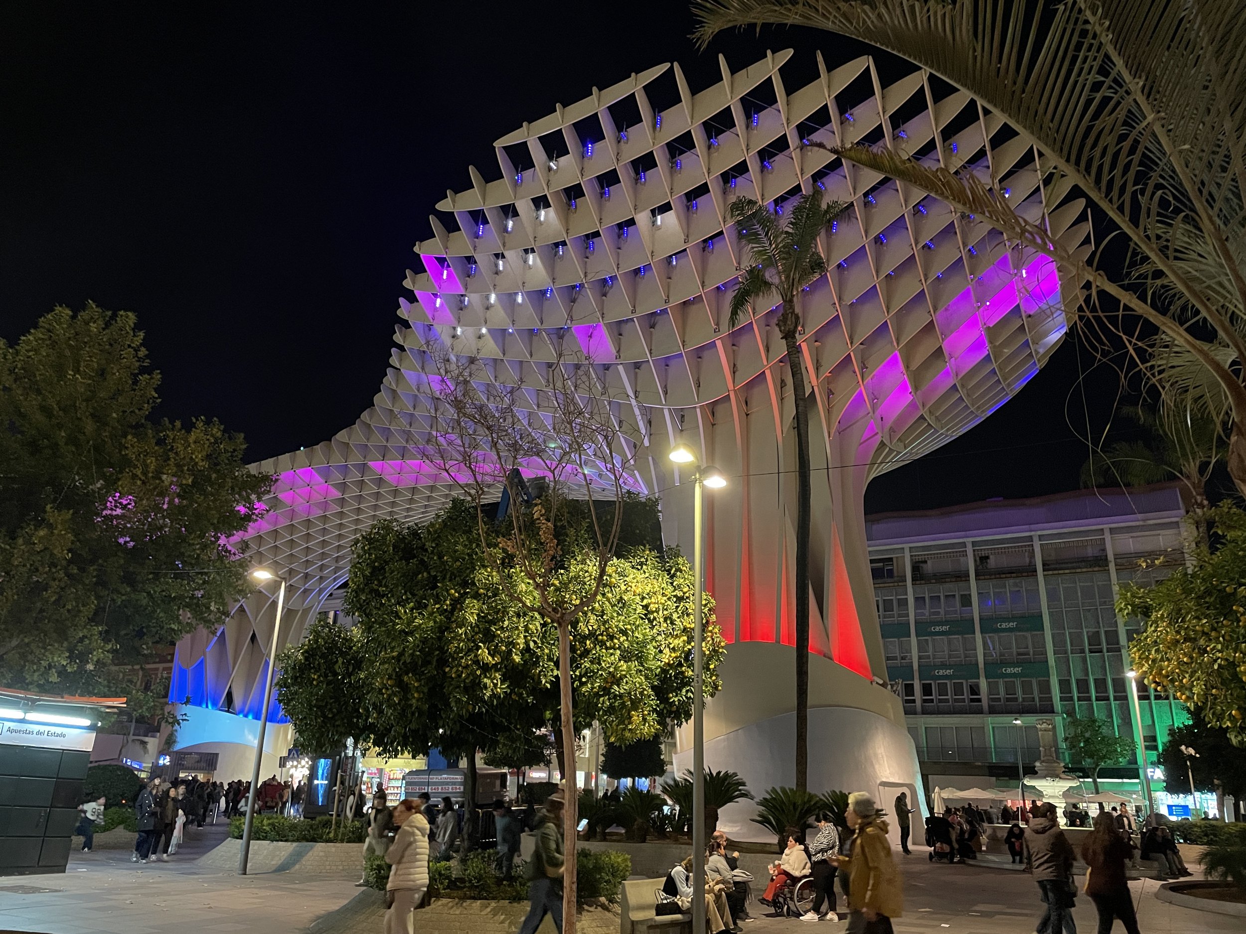 Iltaisin Sevillan suurilla päivänvarjoilla (tai sienillä) pyöritetään valoshow’ta. Kuvassa oikealla ylhäällä loistaa valaistuna Sevillan maailmanperintökohteen torni. (Kuva: Janne Rantanen)