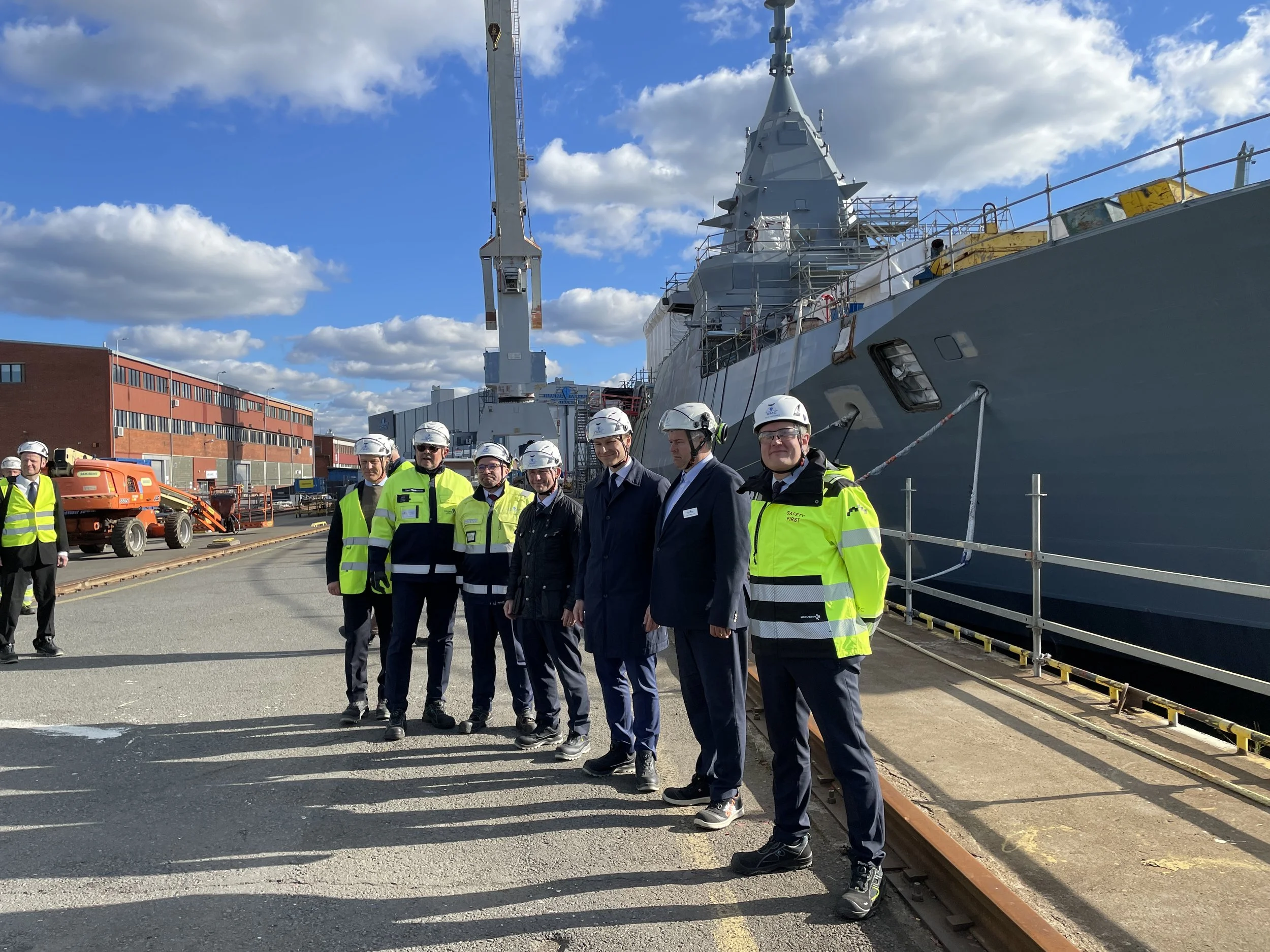 Taistelulaivojen tuotantoon tutustumassa oikealta RMC:n operatiivinen johtaja Ville Laaksonen, Ruotsin puolustusministeri Pål Jonsson ja Suomen puolustusministeri Antti Häkkänen sekä RMC:n toimitusjohtaja Mika Nieminen. Taustalla rakentumassa toisen monitoimikorvetin ohjaamo. (Kuva: Janne Rantanen)